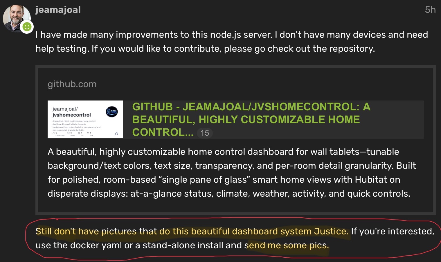 He has tons of pictures. What he's saying is that the pictures he has don't do the solution justice. Some people really like dashboards and this could be a beautiful solution for them. I prefer to do hands free automation with voice (Alexa and/or Siri) for what can't be made completely automated. But this looks great.