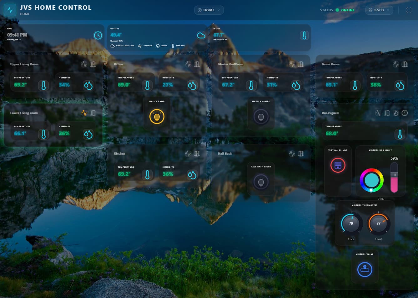 Blur and transparency — The room card blur and transparency settings can dramatically change the look of the dashboard. Play around with them — I tend to like about 25% transparency and 5% blur. These settings are really dependent on your background image. A very bright (less transparent) background needs stronger card opacity settings, or the room cards start to disappear into it.