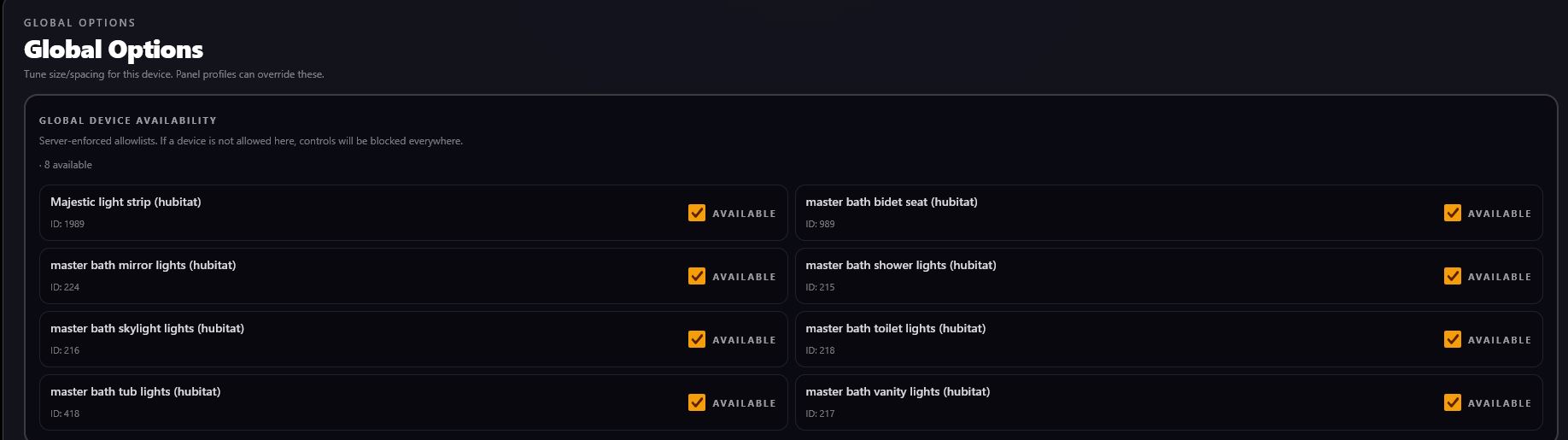 The global options handle what's available in any single panel. The device options are per panel device options that have to be configured to allow those globally available devices to appear