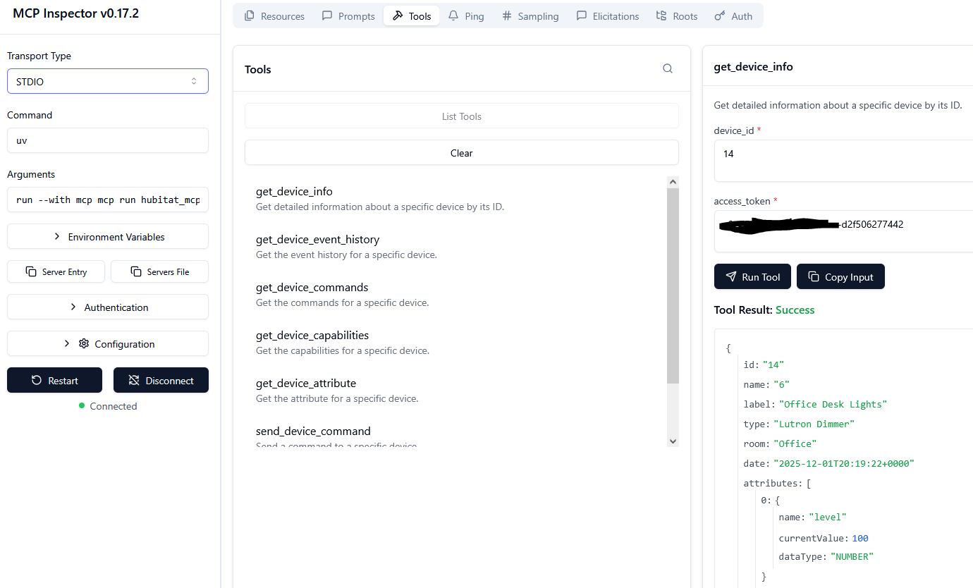 I wrote a Hubitat MCP server in python and it is working with VS Code and MCP Inspector as the client.