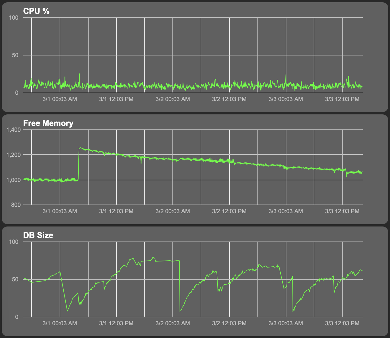 Here are some graphs over the last few days. I've still got plenty of memory apparently, and my C8 Pro is obviously not straining at all. So I'm not too worried. A reboot resets it. But it would be nice to know what's causing this. I haven't added anything new since updating to 2.4.4.135.