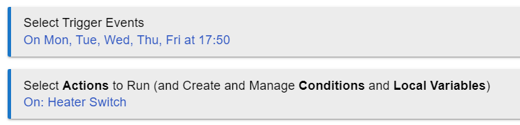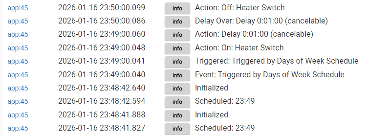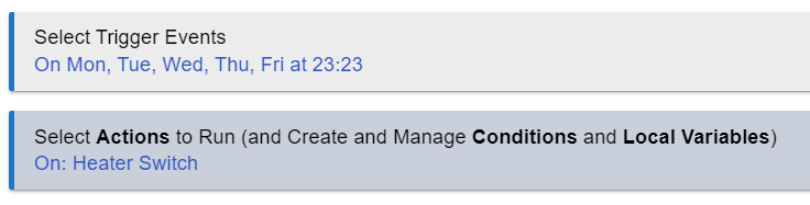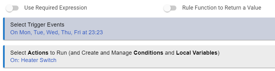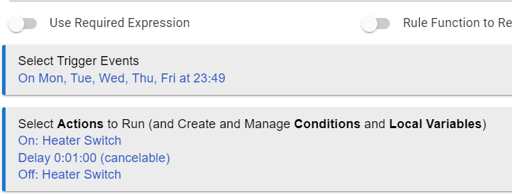 Setting Heater switch to turn on at specified time on weekdays. Added a rule via Rule Machine, clicked Done, but nothing triggers even after time has passed. Am I missing something? Hub's date and time are accurately synced to local time.