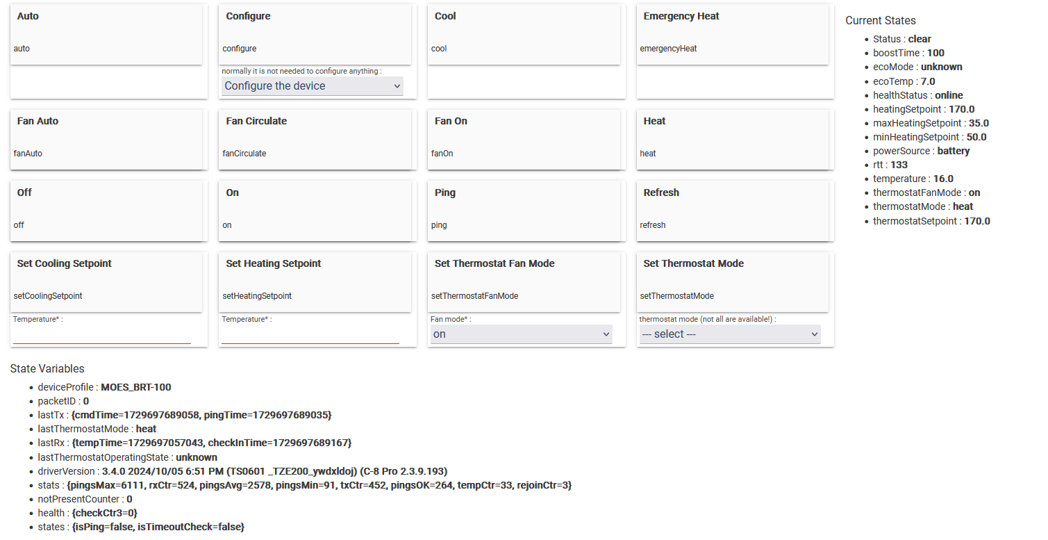 currently using Tuya Wall thermostat, with 'model group' = Moes. The attributes missing are : thermostatOperatingState, supportedThermostatFanModes, supportedThermostatModes. But these are not definable in the device page.