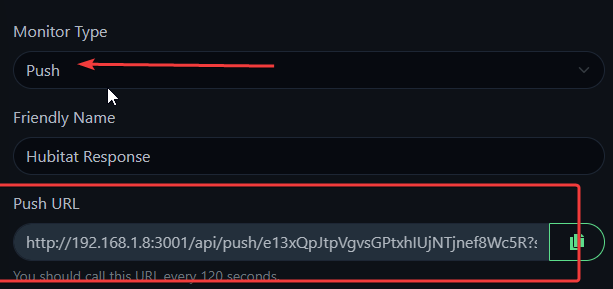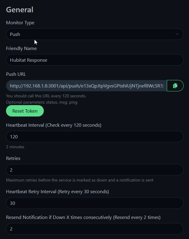 A push monitor. The URL for the push monitor is called by the Hubitat rule. It is set to expect a call every 360 seconds and notify after 2 failures.
