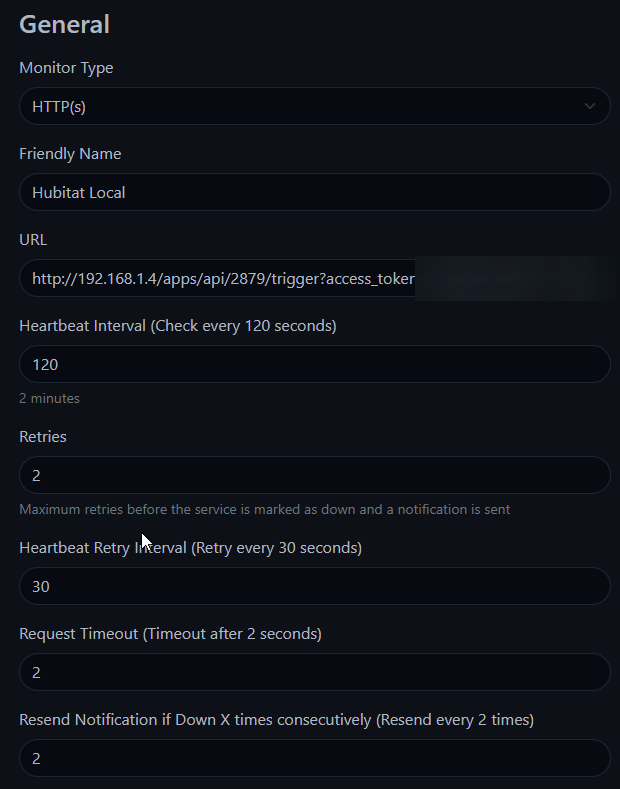 So, I had my system which hosts Uptime Kuma go partially down the other day, one of which services was Uptime Kuma itself. So obviously I had no idea what else was not working until I found out the hard way. Decided I should setup a redundant check to monitor Uptime Kuma and what better place than Hubitat since I have easy access to send notifications.