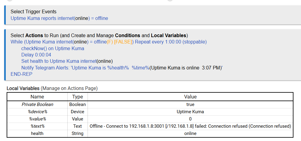 If Uptime Kuma stops calling, the Hubitat sends its notification (this could be looped for repeated notifications if needed).