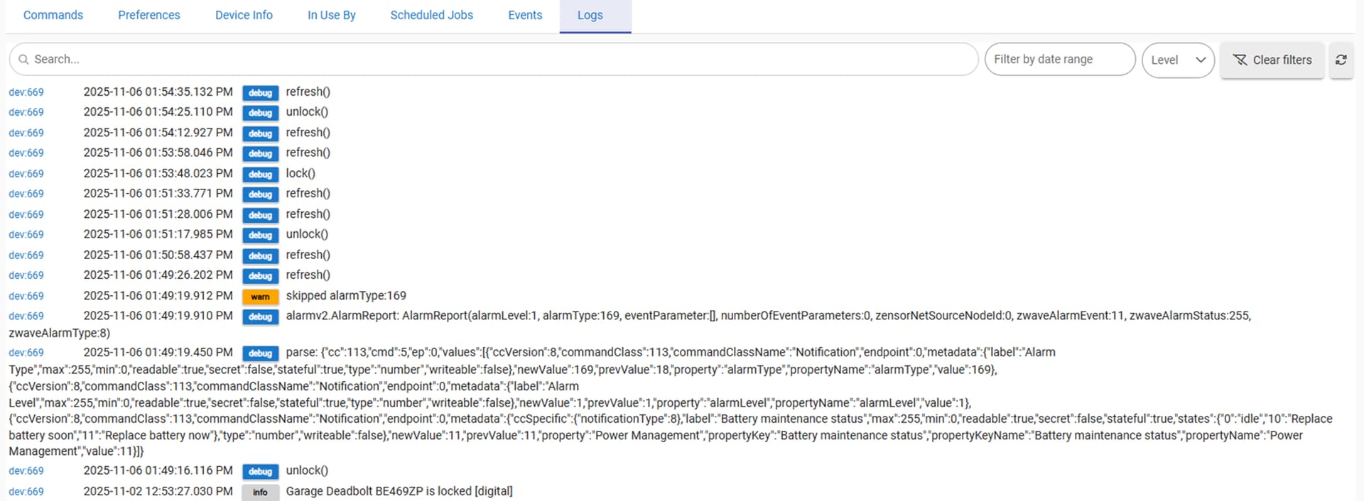 I’m pretty sure batteries are dead. I don’t understand why there aren’t periodic status traffic from the lock to hub in 4 days. I would have expected some traffic. As a minimum a battery warning before dropping to critical level.