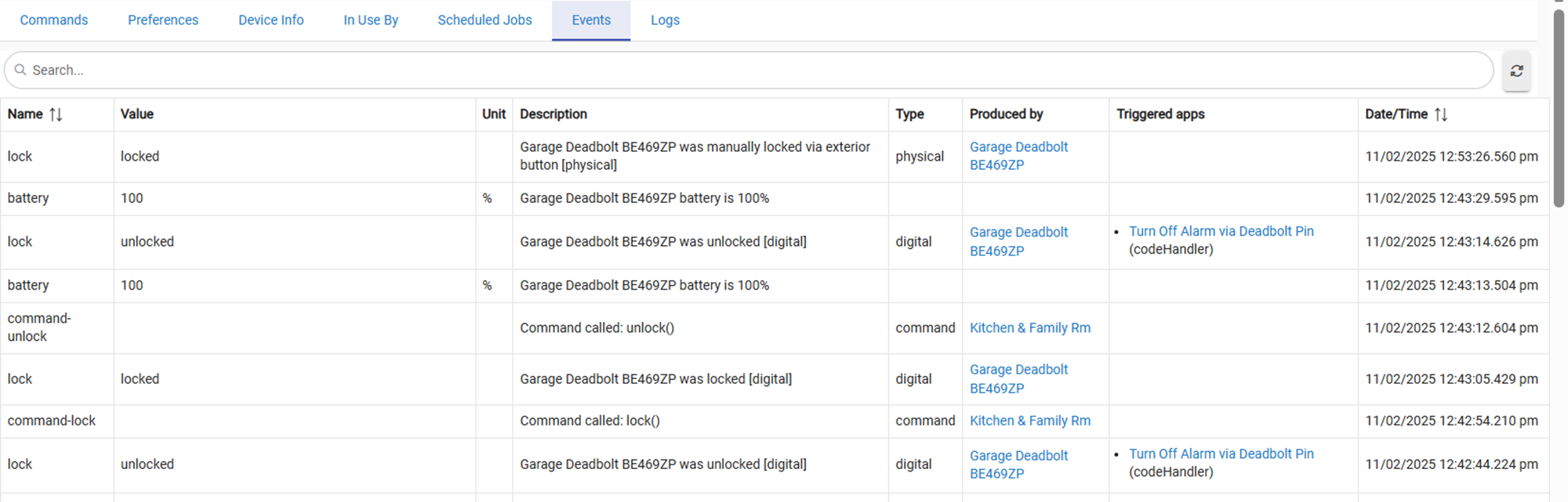 Anyway a little more drama today. I swapped out the batteries with AA Lithium's just to give me maximum duration as I'll be away for a while. After turning lock back on, the ZWave connection to hub was messed up and I couldn't control the lock remotely nor did it receive updates from the lock. Local codes at the lock opened the deadbolt but ZWave was amiss. Showing pending in ZWave details page. After trying to refresh, configure, power cycle, ... and the usual things I gave up and did a device (factory) reset and repaired it with my system I then had to reprogram my codes into the lock and clean up some rules that got messed up (I did a device swap with a virtual lock then back after real lock was OK but that didn't cleanly transfer into the couple of rules). Anyway it works now but I have to say these Schlage locks are junk. A battery change-out shouldn't be a major event. There doesn't seem a soft reset mode, only a factory reset which wiped the lock to step 1. I only got these locks so I could key alike all the locks in the home. I had a Kwikset ZWave deadbolt for years and it NEVER gave me issues. Schlage, it seems there is always something.