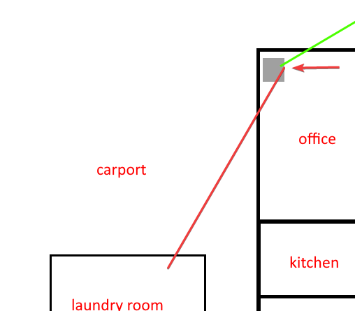 Here's an actual picture to show the proximity between the office and the laundry room. The external wall of the house is block, the laundry room is just siding and framing, no drywall or anything. The block construction of the house doesn't seem to be a problem for other devices which are much farther away, with the entire house between the device and the hub.