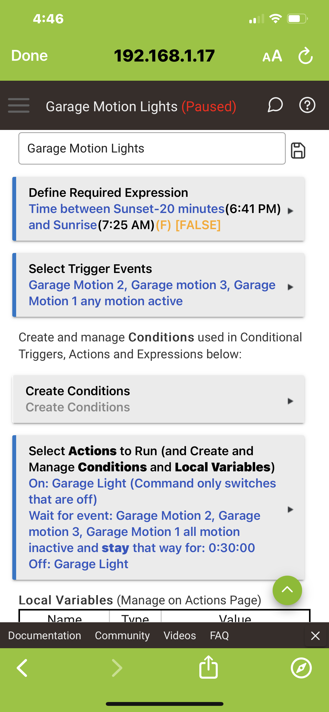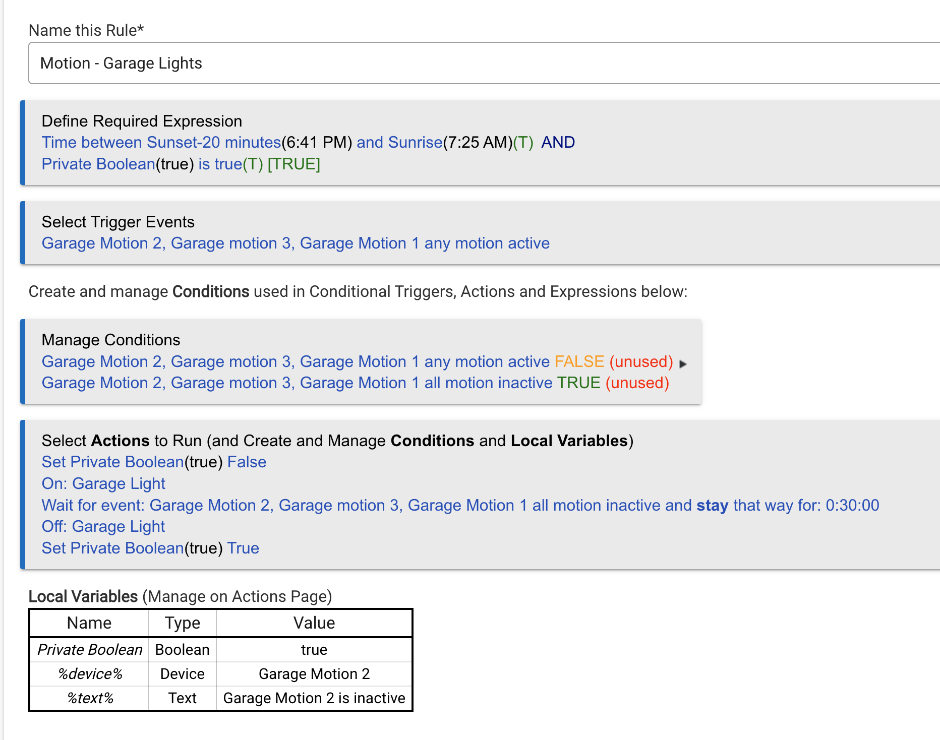 I have a rule for garage motion. I have been using the Motion lighting App but it seems to not turn off the lights when already on. New condition. So. I have a RM set up.