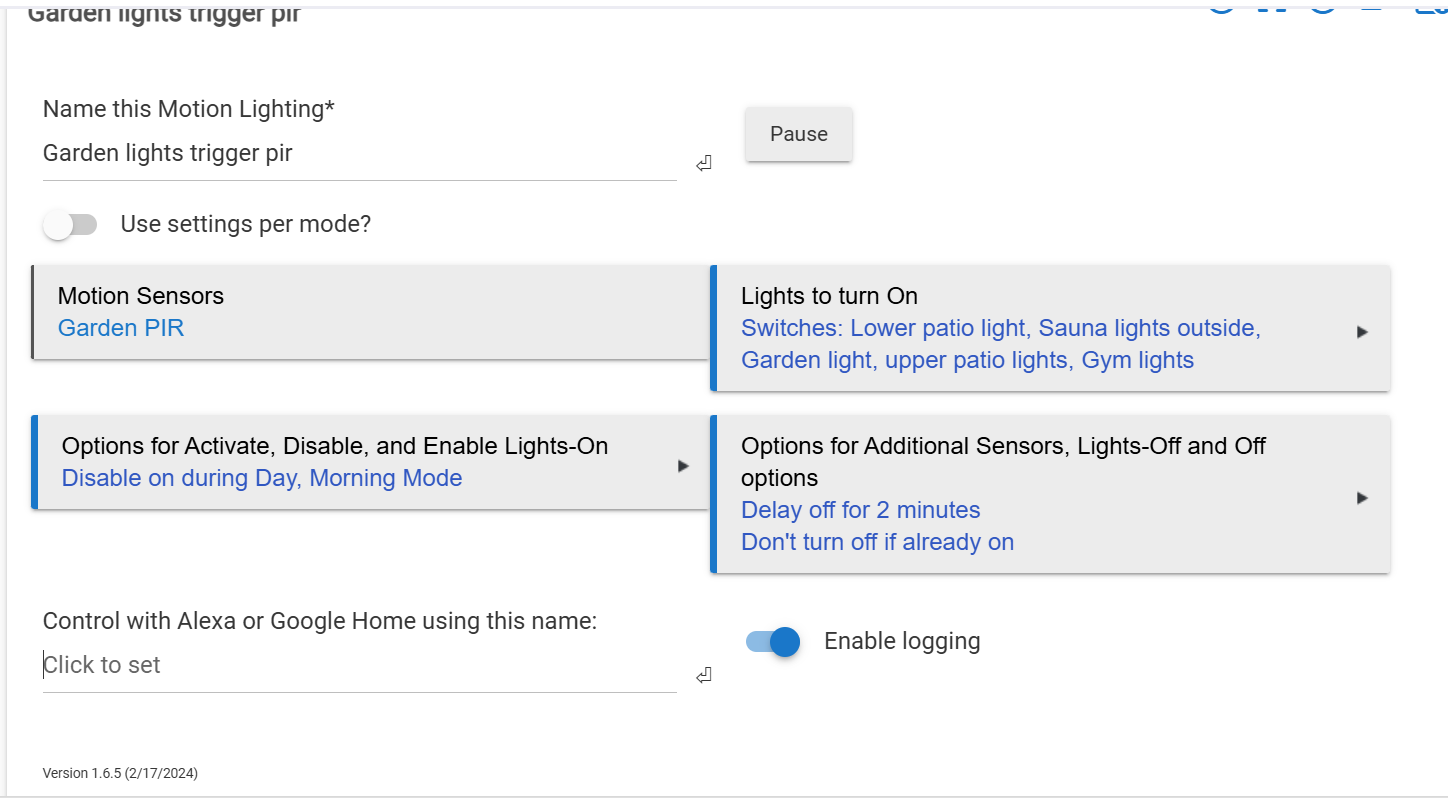 Keep in mind that the app will also not track individual lights -- depending on what it thinks, they'll all get turned on or off with motion, not individual states restored.