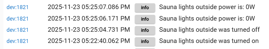 here is the execution log of the sauna outside light. I turned it on via dashboard at 5:11 you see it reports power as a motion had already turned it off this evening.