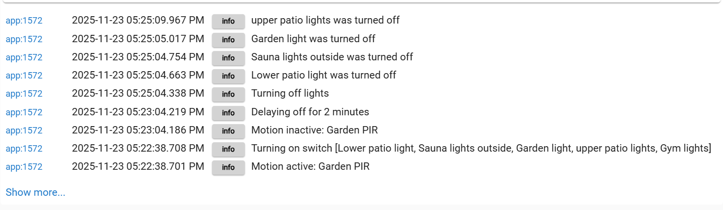 I can quite confidently say Sauna lights outside was on as I can physically see it with the dashboard reporting "on". That is why I am confused by also seeing "on" on the log. I have also turned on via the dashboard the other lights pre trigger, and they too get turned off.