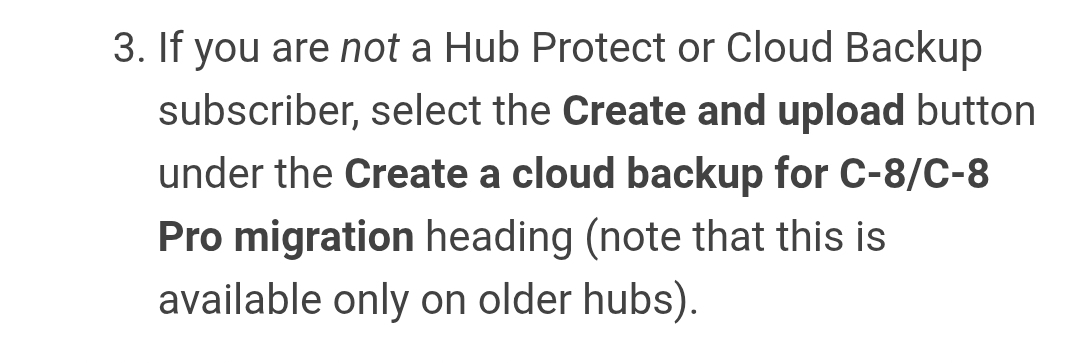 I did this registering the new hub with my existing login/password. When I click on setting->Hub Migration it cant find any cloud backups at all. I need to migrate my C7 data, and without that capability I have no use for this C8-Pro hub. If I need to purchase another cloud backup to make this work then I'm ready to do this.