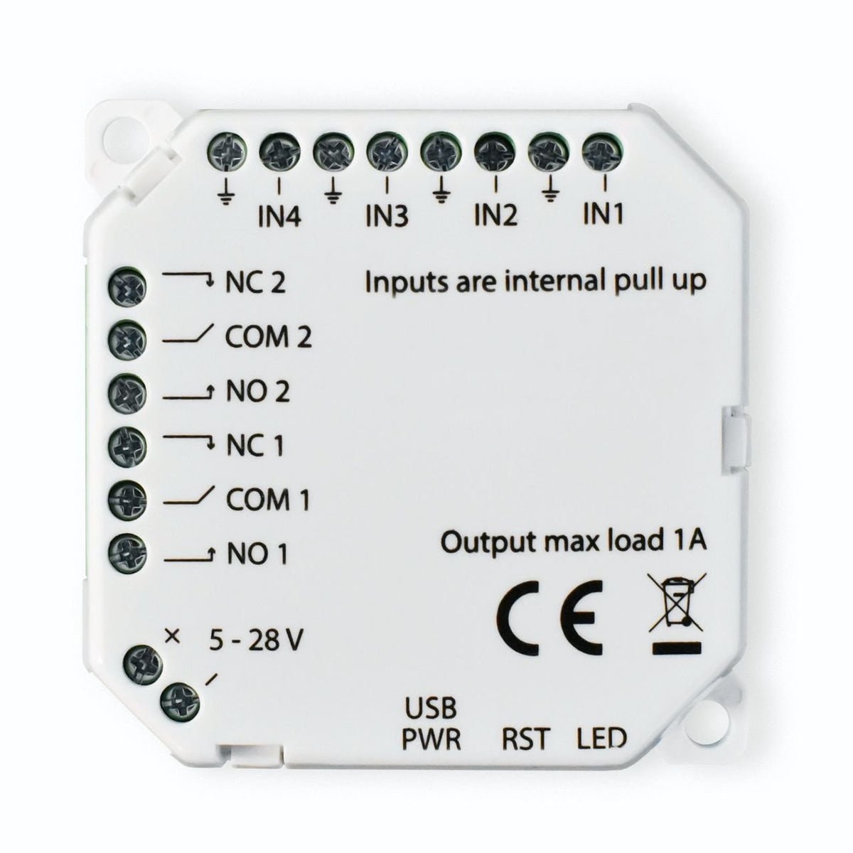 Here's the device that I use to perform the relay and contact functions. It's small, easily mounts in the garage and has a variety of power supply options :