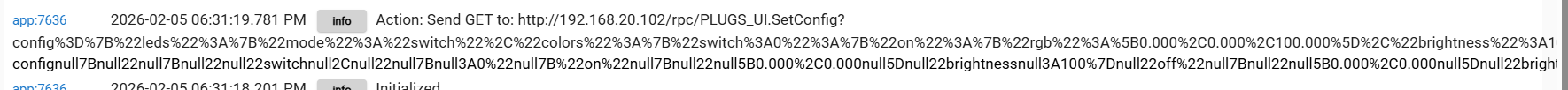 http://192.168.20.102/rpc/PLUGS_UI.SetConfig?config%3D%7B%22leds%22%3A%7B%22mode%22%3A%22switch%22%2C%22colors%22%3A%7B%22switch%3A0%22%3A%7B%22on%22%3A%7B%22rgb%22%3A%5B0.000%2C0.000%2C100.000%5D%2C%22brightness%22%3A100%7D%2C%22off%22%3A%7B%22rgb%22%3A%5B0.000%2C0.000%2C100.000%5D%2C%22brightness%22%3A100%7Dhttp%3A%2F%2F192.168.20.102%2Frpc%2FPLUGS_UI.SetConfig%3Fconfig%3D%7B%22leds%22%3A%7B%22mode%22%3A%22switch%22%2C%22colors%22%3A%7B%22switch%3A0%22%3A%7B%22on%22%3A%7B%22rgb%22%3A%5B0.000%2C0.000%2C100.000%5D%2C%22brightness%22%3A100%7D%2C%22off%22%3A%7B%22rgb%22%3A%5B0.000%2C0.000%2C100.000%5D%2C%22brightness%22%3A100%7D