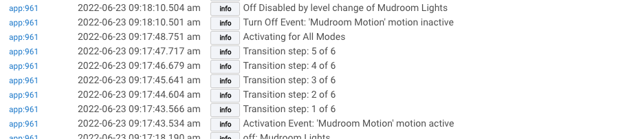 @bravenel, I thought I'd try the transition for activation and found it doesn't seem to work if I also prevent motion inactive from turning off the lights after a level change. Here's what the logs show: