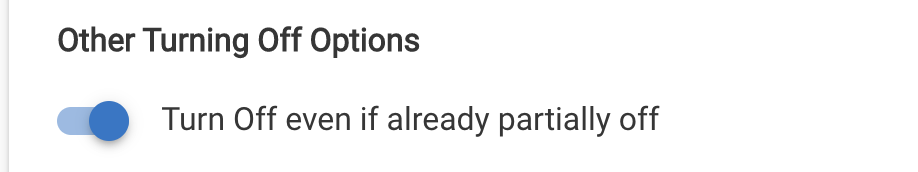 The default behavior of Room Lights is to only Activate if not already Active, and to only Turn Off if already Active. This works for most scenarios. Where it doesn't work are situations where the lights are being independently turned on or off outside of the app. For these situations there are matched options to force Room Lights to Activate, or force it to Turn Off, irrespective of what it thinks its Active or Turned Off state is.