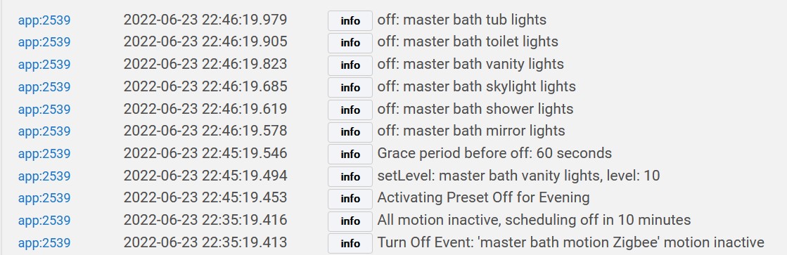 In the same rule, I'm using preset off with all 6 lights in the evening and 3 in sleep mode (since only 3 are supposed to be on). However, while in evening mode, although the log says "activating preset off for evening," it's actually implementing the sleep preset (it does correctly turn off all 6 lights after the grace period expires):