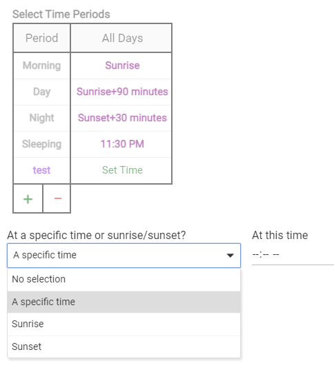 I'd really like an "earlier of two times" added as an option for when to start a time period. Sunset and sunrise varies a lot depending on the season. I have not been able to move most of my lighting rules over to RL from RM and I would really like to.