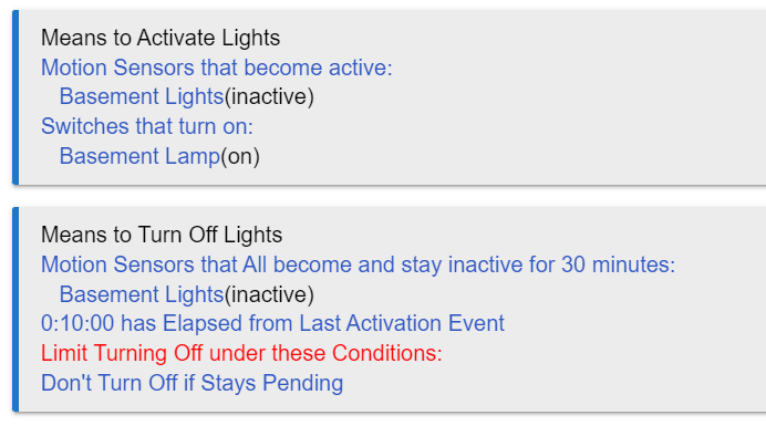 Maybe this can already be done easily, I'm not sure. An option to have a "cooldown period" after a RL instance is turned off before it can activate again. Even though most of our lights are automated, it's been drilled into our heads to turn the light off when leaving a room for nearly 35 years. Mostly this bugs my wife, that sometimes she turns off the lights as she leaves and the motion sensor turns them back on almost immediately. Also sort of an edge case because it only happens if the motion sensor is retriggering at that time too, but it happens enough that it gets complained about.