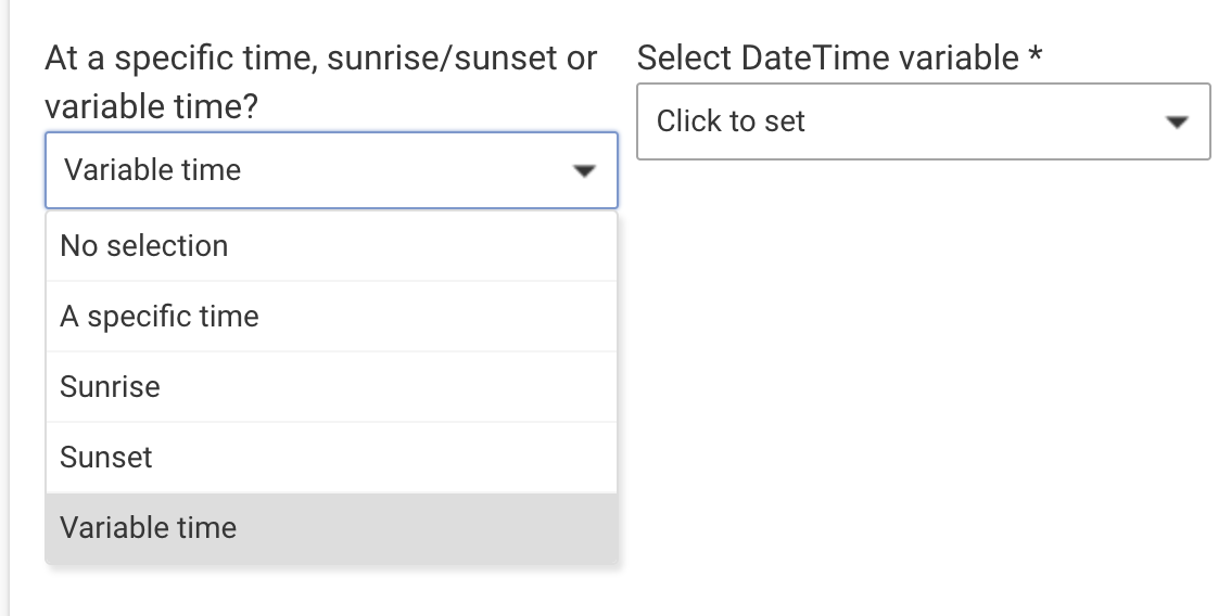 It's not showing you the option for Variable time because you don't have any DateTime variables. My screenshot above is what you get when there are DateTime variables to select from. Exact same context you are describing (my Dawn time set for 5:15, but selecting Variable time instead below):