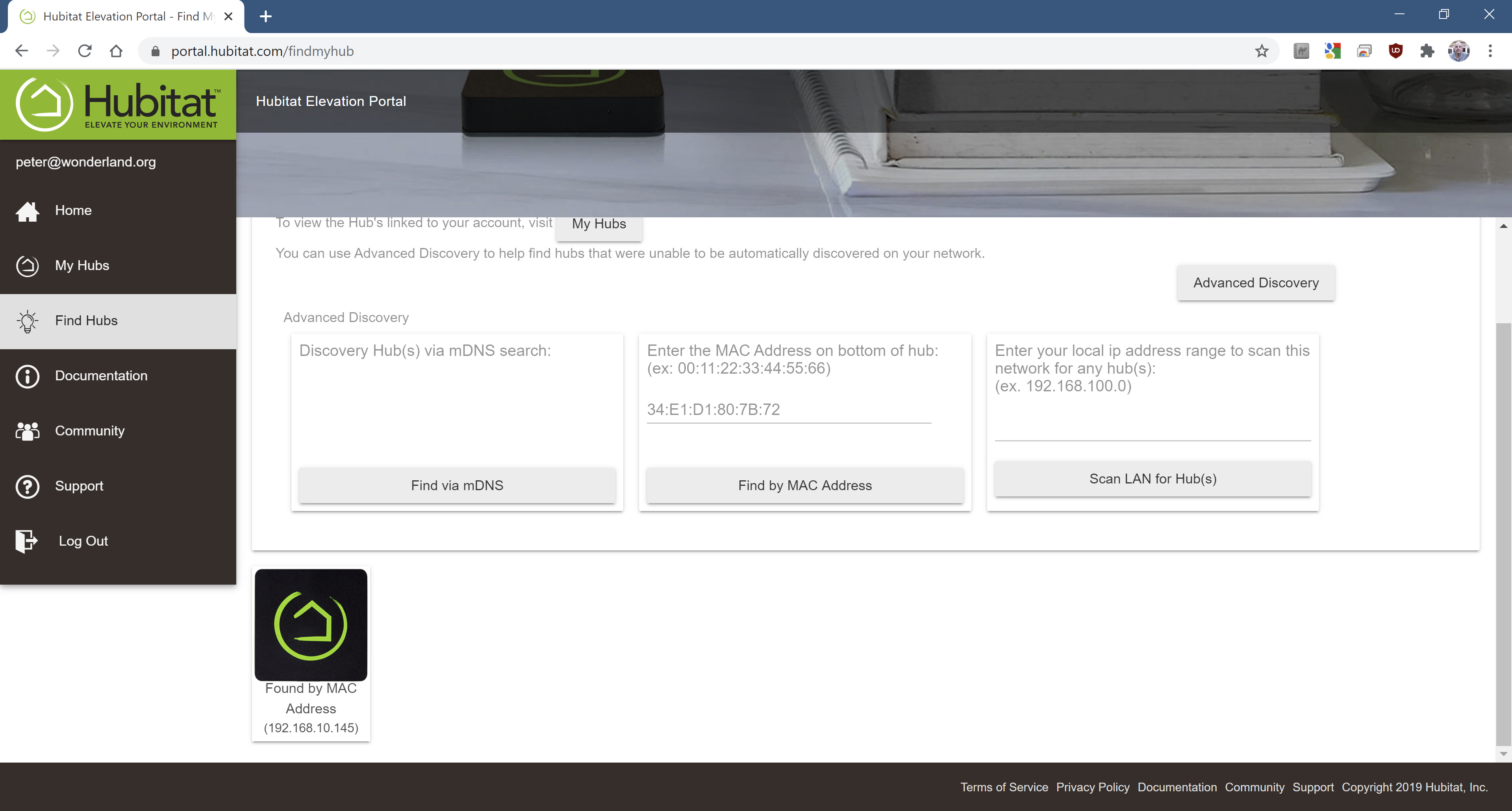 I went to portal.hubitat.com and did the searching with no results. Entered the MAC and it find a hub on 192.168.10.x when my home network is 192.168.234.x - and DHCP has assigned an address on the latter to the hubitat device too.