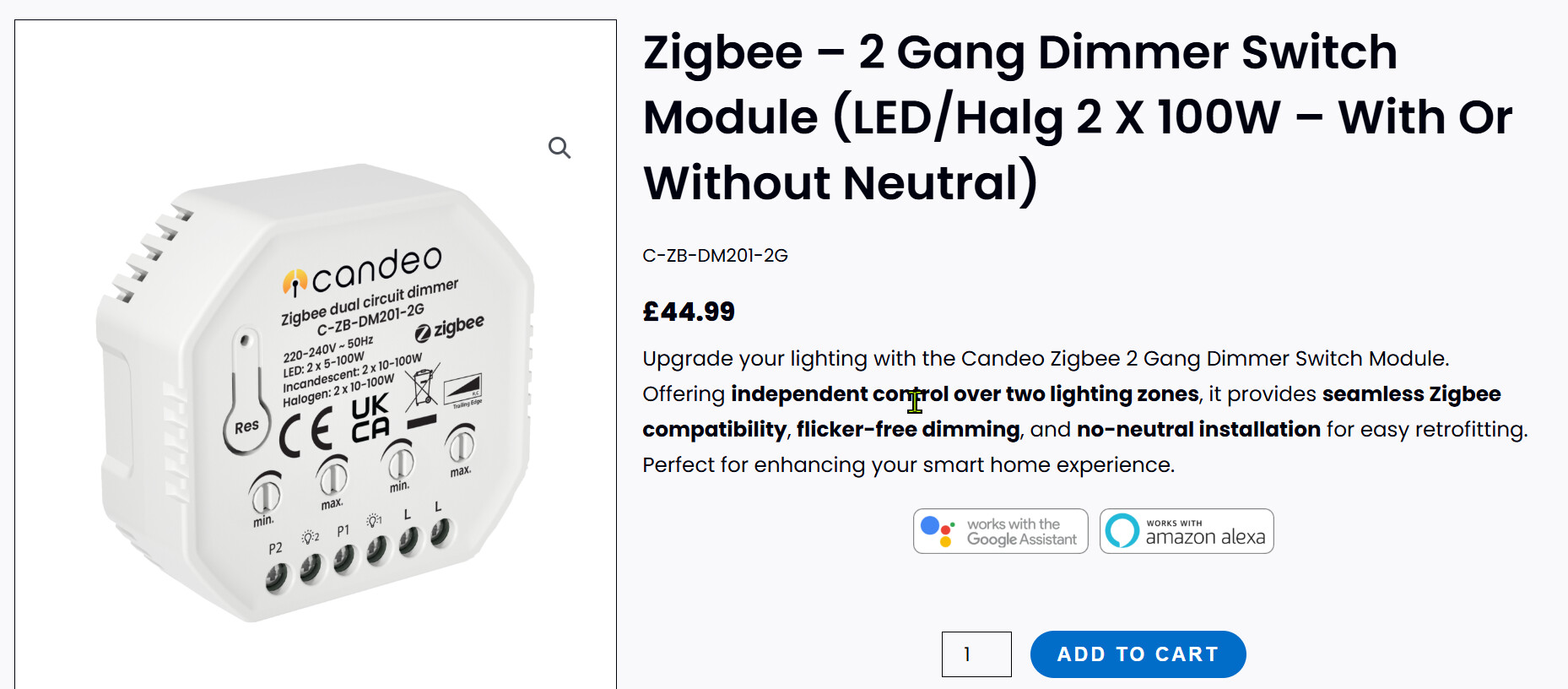 We’ve recently released a 2-gang version of our C201 Zigbee dimming module; it works in a similar way to the original, with two independently controllable channels and physical inputs for retractive switches.