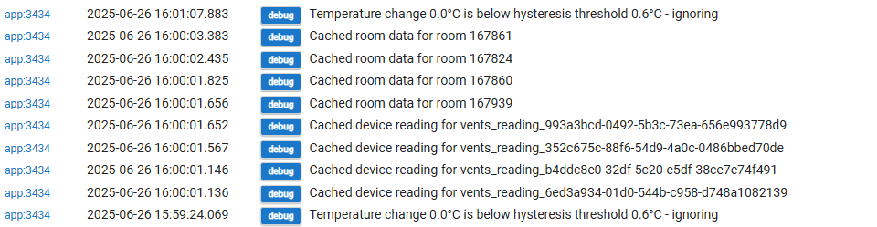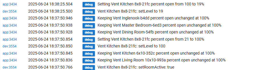 To stop these messages from appearing in your logs, go to the Flair Vents app settings and set the Debug Level to "None". I also just pushed version 0.2 of the beta which reduces log verbosity further, plus includes other improvements.