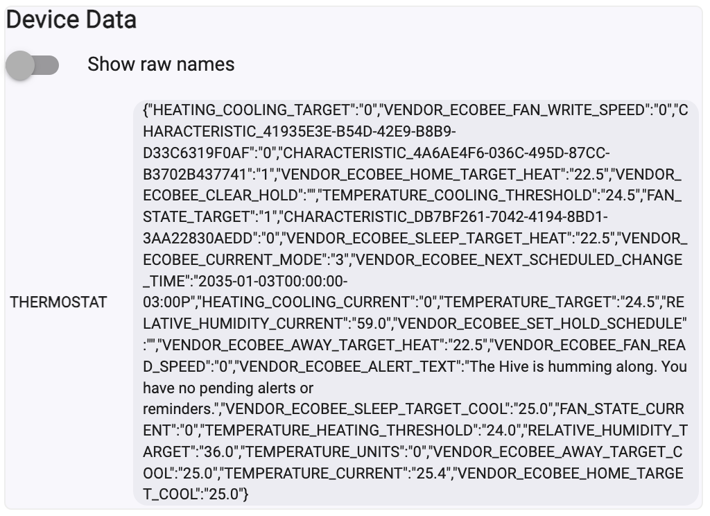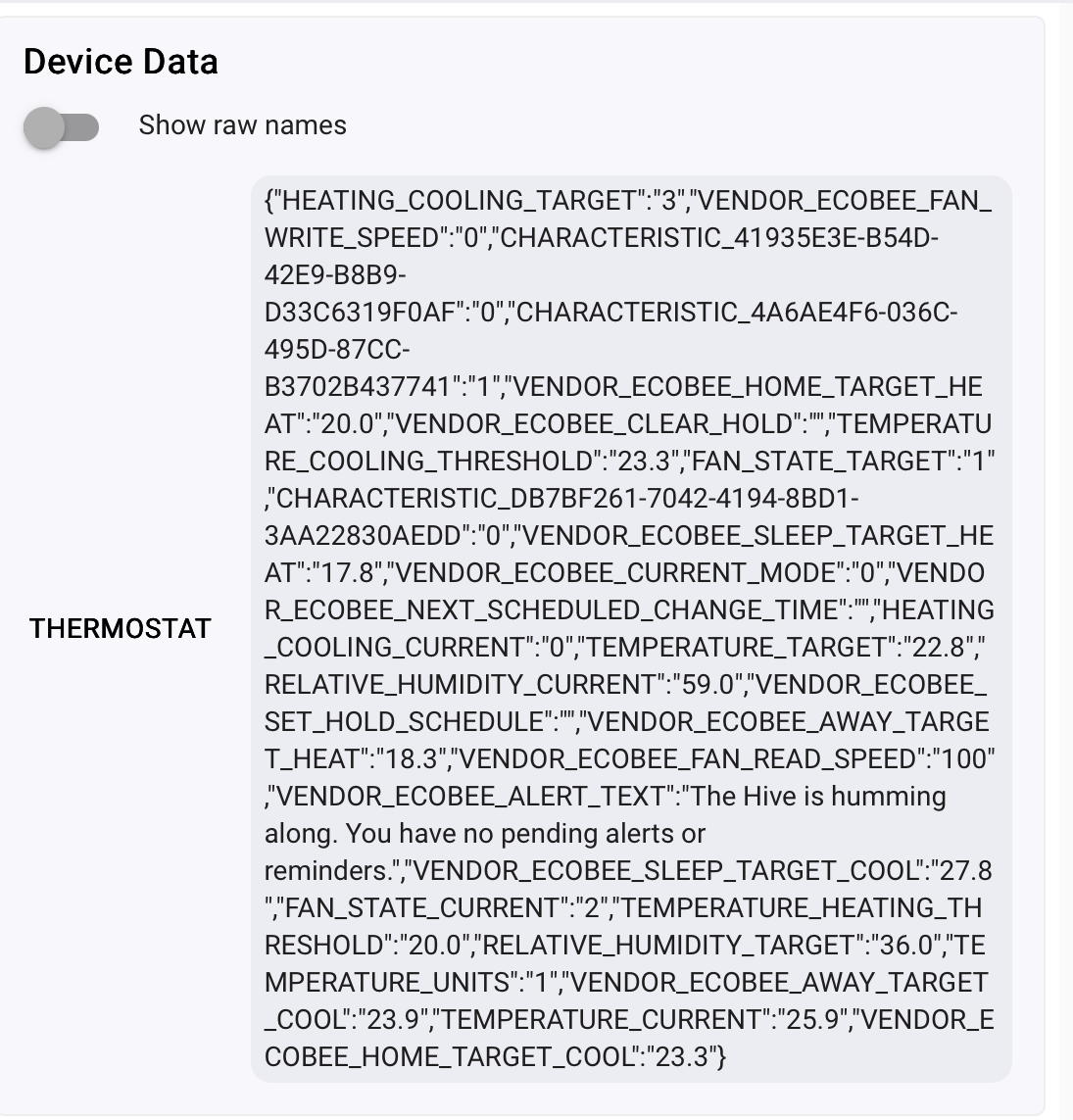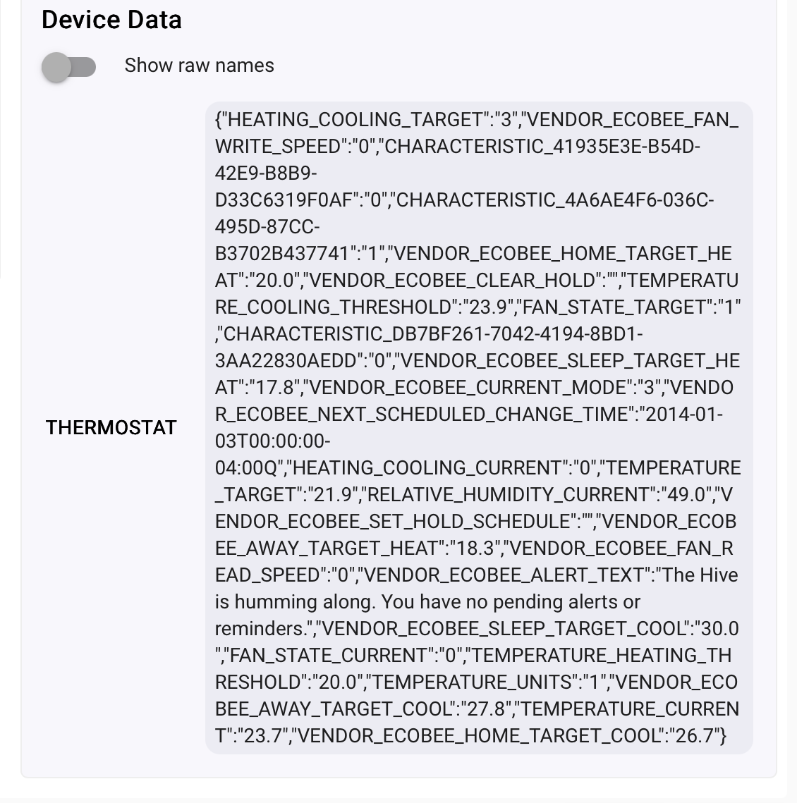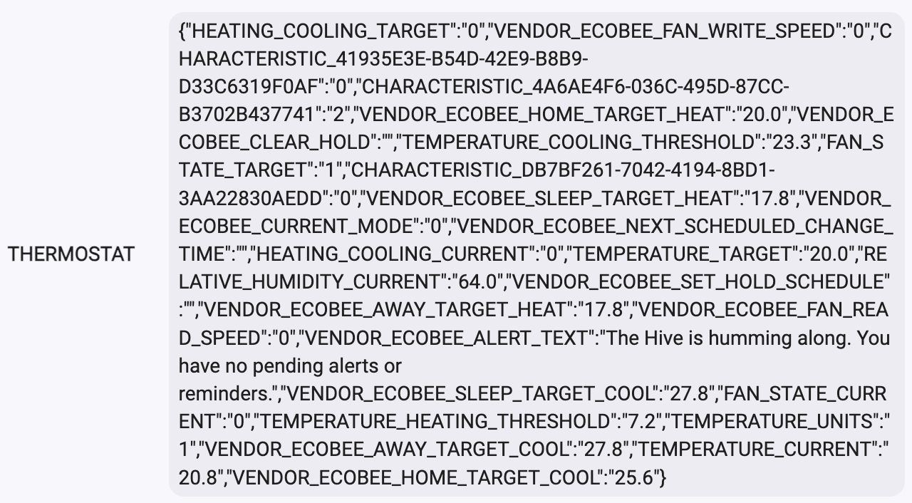 Can you copy/paste the thermostat's device data from the Device info tab in device details? It will look something like this: