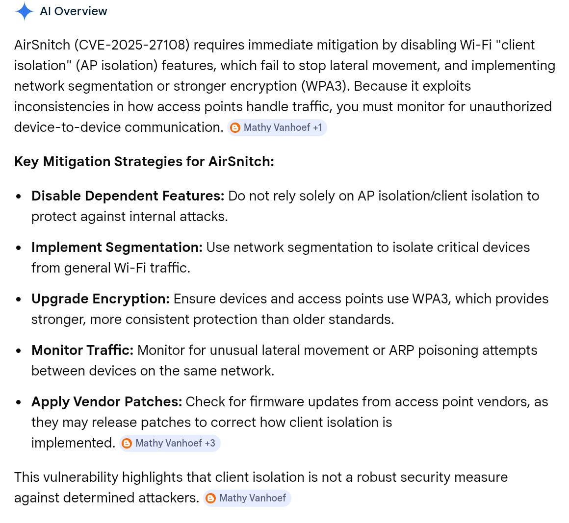 One of the main takeaway issues, in my view, is that it's just hard to correctly deploy client isolation in more complex networks. I think it can be done using modern hardware, but it's very tedious. We didn't test with VLAN separation, but using that can definitely help. Enterprise devices also require a high amount of expertise, meaning we might have missed some specialised settings.. So I'd recommend testing your Wi-Fi network, and then see which settings or routing configurations to change: GitHub - vanhoefm/airsnitch