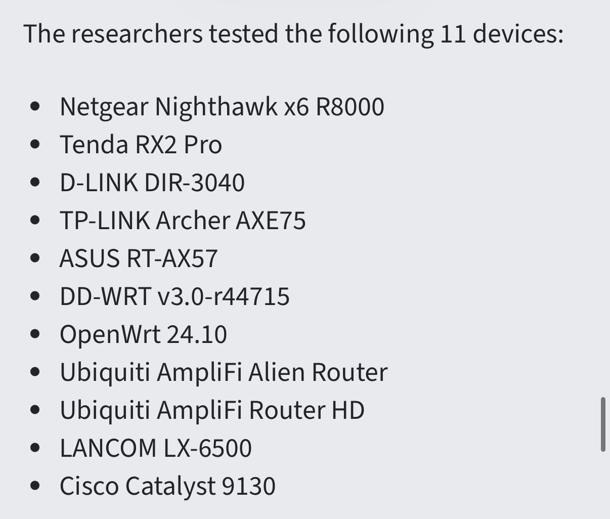 No, that was their list of tested routers. The implication was that since EVERY tested device was vulnerable to at least one of the methods, then ALL devices must be vulnerable.