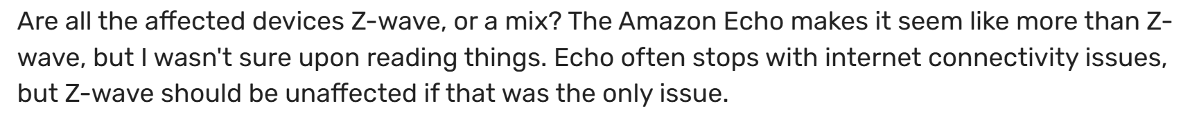 Are all the affected devices Z-wave, or a mix? The Amazon Echo makes it seem like more than Z-wave, but I wasn't sure upon reading things. Echo often stops with internet connectivity issues, but Z-wave should be unaffected if that was the only issue.
