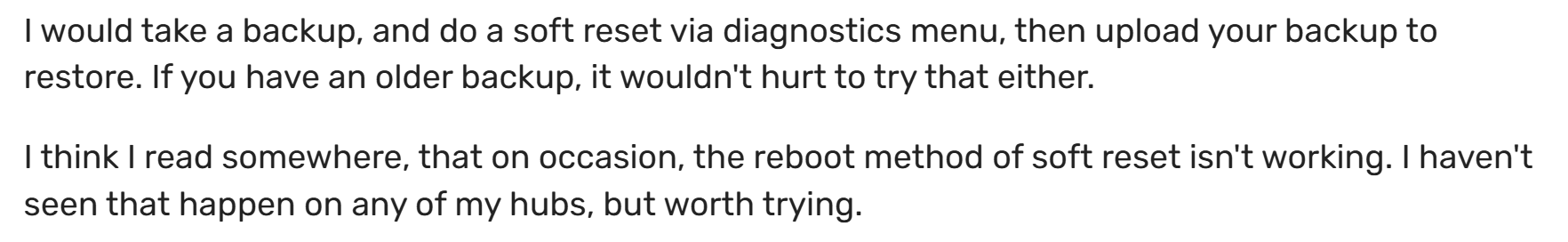 I know there are a ton of people here that know what they're doing. That's great. I have spent COUNTLESS hours on figuring out home automation, zwave, zigbee, networking, Hubitat, apps, etc. etc. I'm just looking for support -- NOT on adding a new app -- I've asked that before and figured that out. Not mission critical. But my entire time investment is DOA when I did nothing. So, the fact that there "many people here that know what they're doing" doesn't help me if 1) they've got other things to do, or 2) there is nothing in the community to help my situation, or 3) there IS something in the community to help my situation, but I can't find it despite searching. So, yes, the community is great -- if and when you can find something. And believe me, this is not my first time struggling with finding help here.