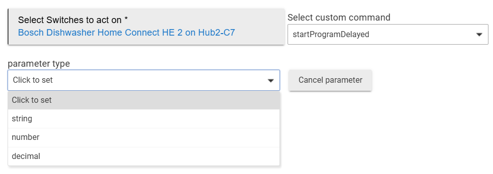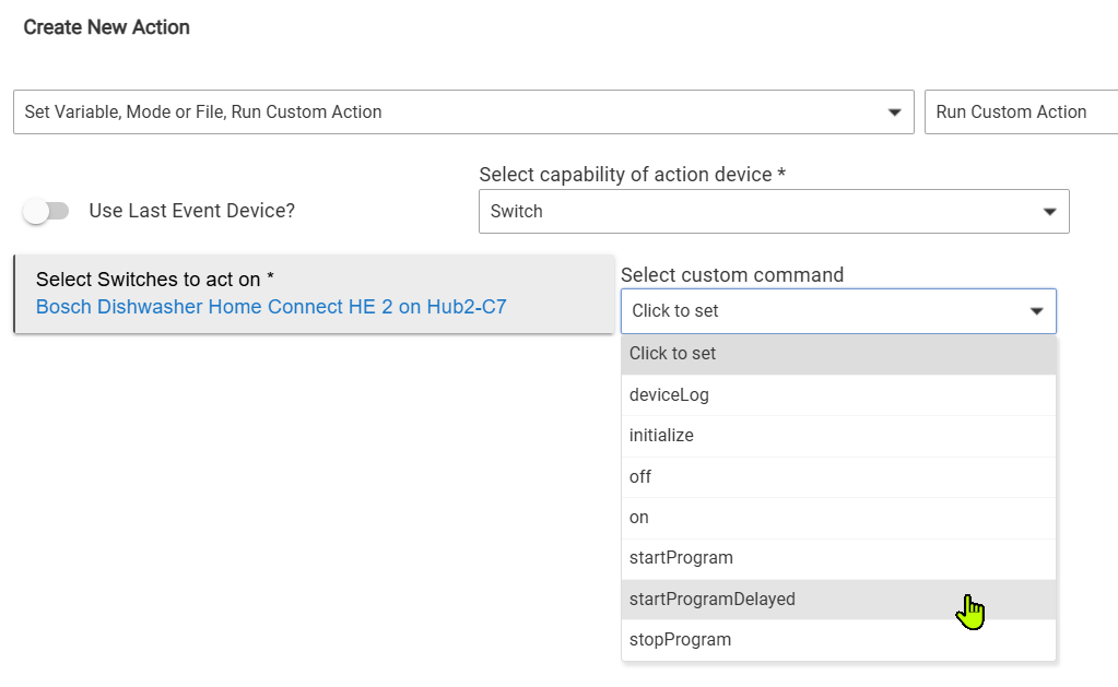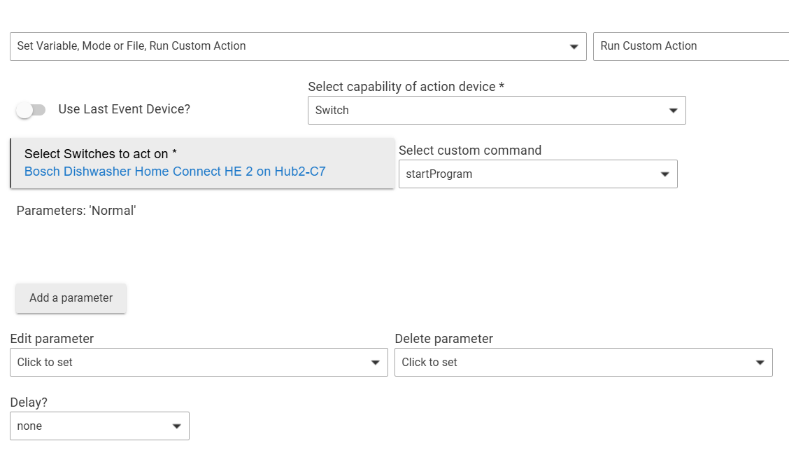 If I choose Switch as the custom action type there is a startProgramDelayed option, but that only seems to allow delaying by some set amount of time, you can't set a time of day for the cycle to start.