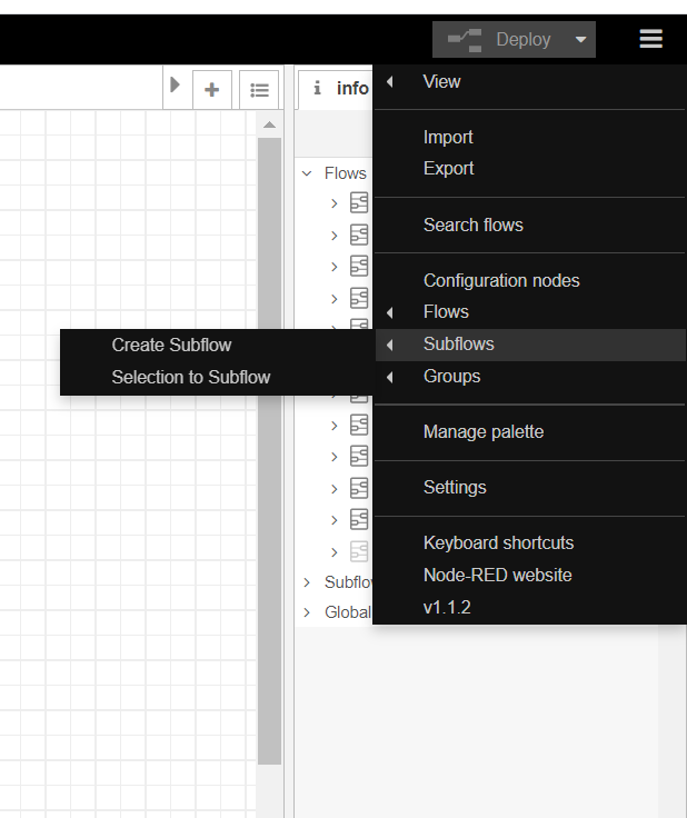 So you can create it from the "hamburger" menu located on the upper right of the UI "/subflows/create subflow" OR even more fun is select a group of nodes / sequence you want to use and from that same subflow submenu use "/subflows/selection to subflow"