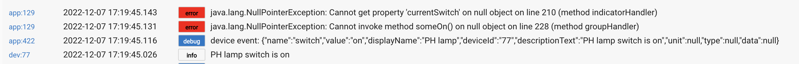 What is app:129? You can click or tap the "error" box (or the similar "info," "debug," etc. boxes) to go to that app. The method names suggest it might be something from Groups and Scenes. If this guess is correct, what kinds of devices do you have in that group or scene? You could try just hitting "Done" in that app and see if the problem goes away after that (maybe you deleted a bulb/switch that was once part of the group?).