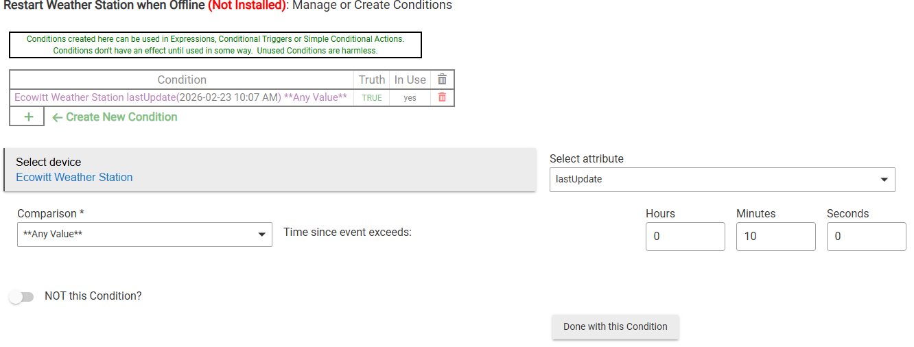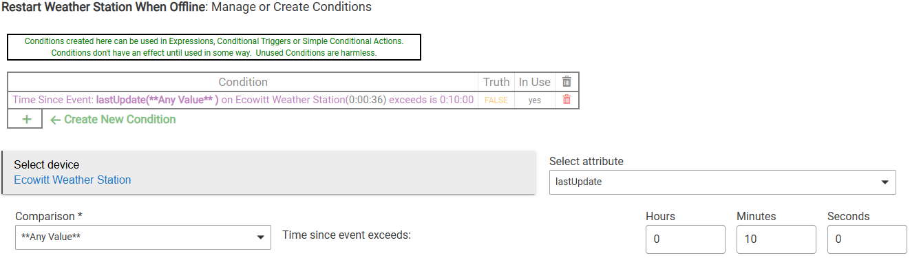 I deleted the rule and rebooted for good measure. Now I'm trying to recreate the rule. I set up the periodic trigger but the condition won't re-create the way it was before. This is how I had it set up before and it evaluated to false as long as updates were happening and then it would evaluate true when the station stopped responding:
