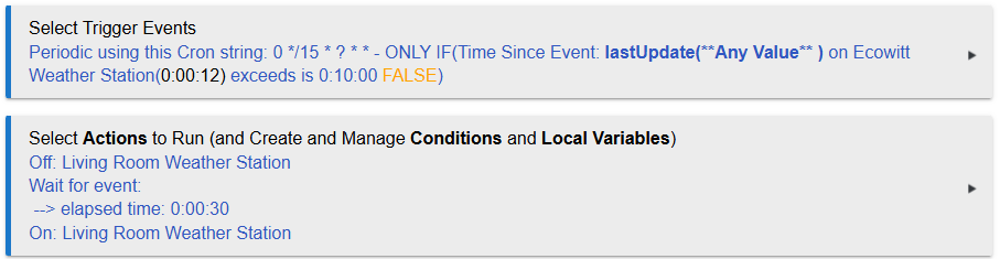 As a side note, Ecowitt is sending a replacement under warranty. Hopefully it is just a bad station, and I don't really need this but would still be nice to have since I have other rules set up to shut down my A/C when it is too cold outside and stop watering when the weather turns bad. So, I still need a reliable method of restarting it if it stops reporting.