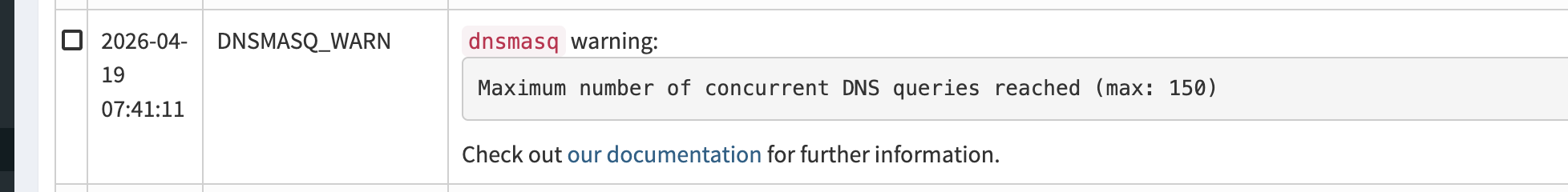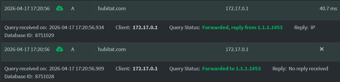 Hello, I recently installed pi-hole. It is a great tool to not only block unwanted content, but gives some great insight into your network that goes otherwise unnoticed. For Hubitat I am seeing the error "Maximum number of concurrent DNS queries reached". Could anyone help me understand the message and if/what may be done to address it? Thanks so much in advance for any guidance here.