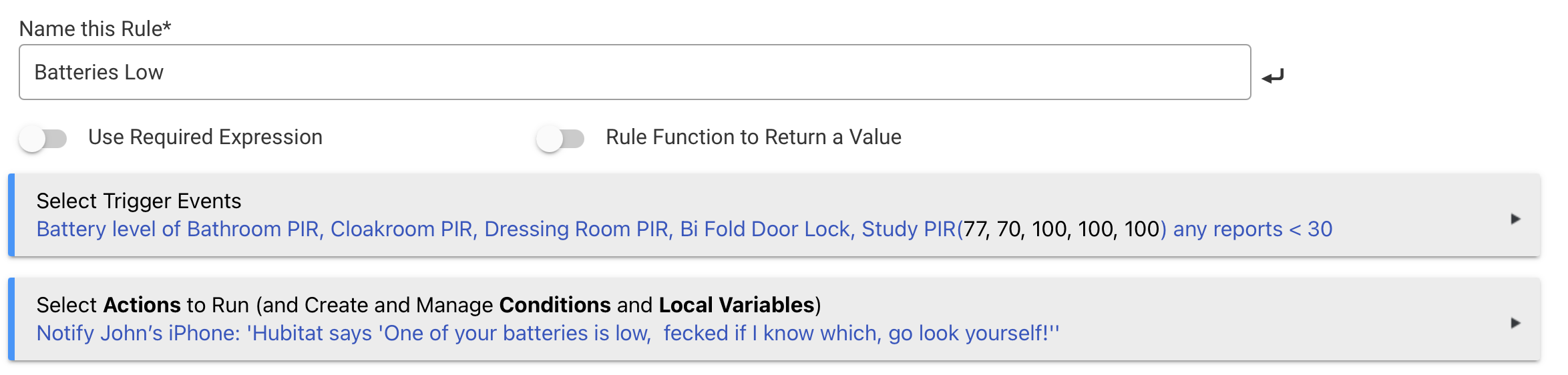 I never bothered to diagnose the problem at the time. It might be possible to replicate it by adding one virtual motion sensor in with the others and altering its battery level (though Iām not sure whether a virtual motion sensor has the battery level attribute?)