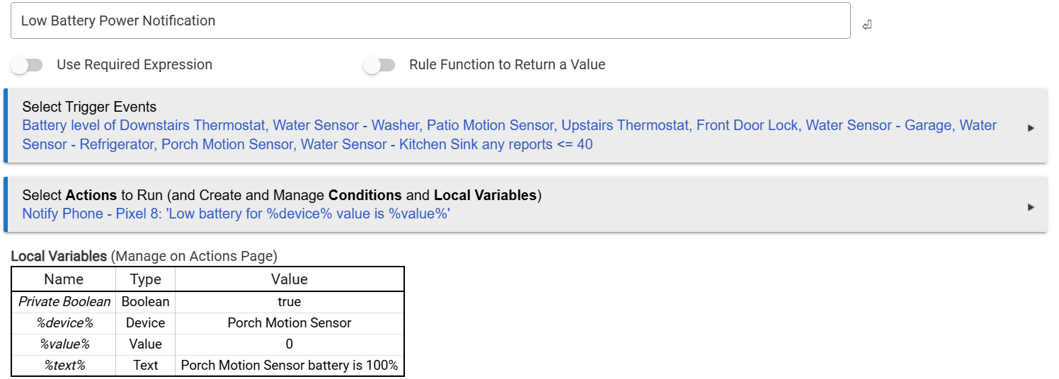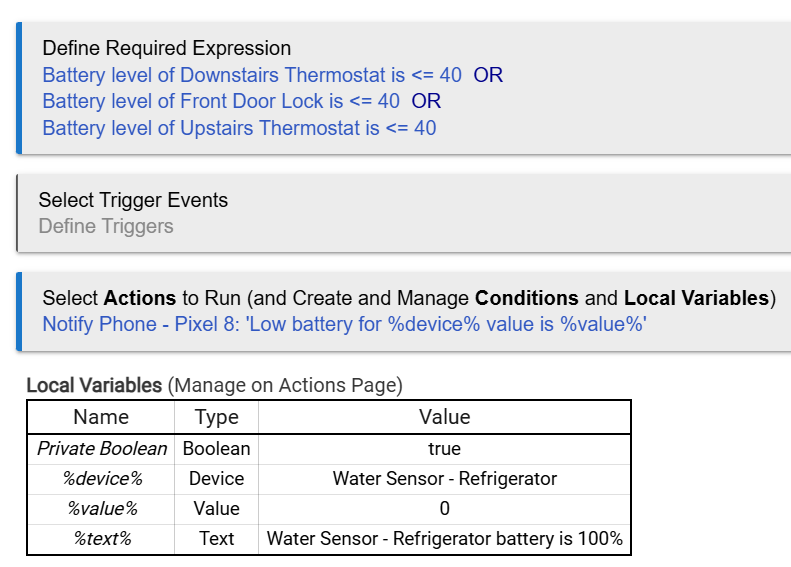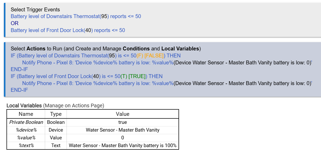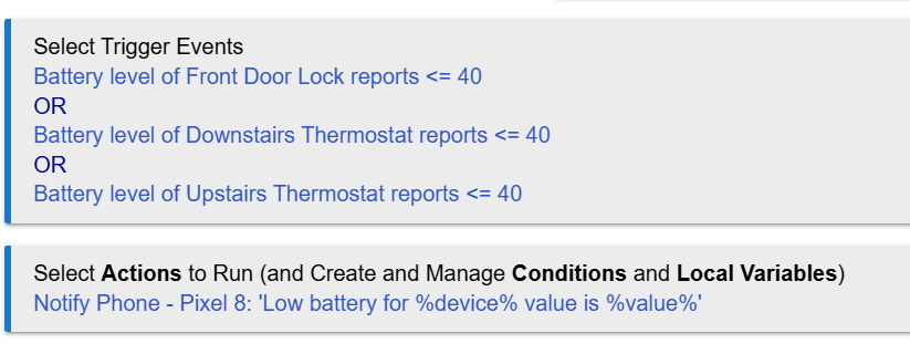 Thanks. I figured out how to add the "OR" logic. But I'm still stuck. Even though the Front Door Lock is the only device at 40%, I'm still getting notifications for devices at 100%. I'm trying to get a handle on creating this logic in Rule Machine for other purposes.