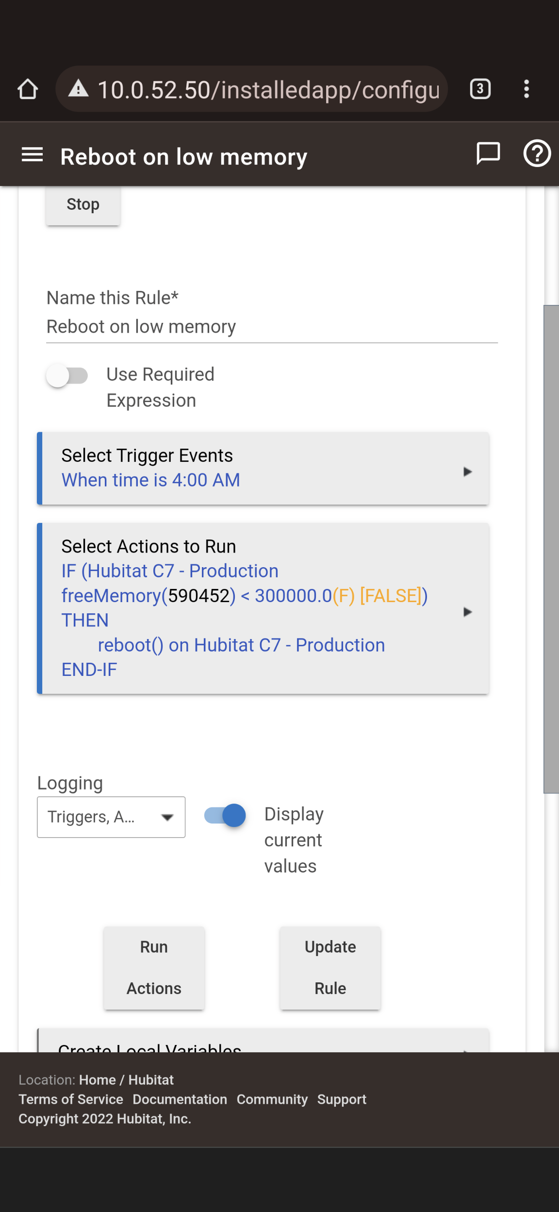 @dJOS The comment you quoted was in regards to the updated Required Expression and Trigger that you posted today and the trigger not satisfying the first part of the IF-THEN logic. It won't show in your logs until the next time the rule runs and reboots your hub. Your hub, your rule, good luck!