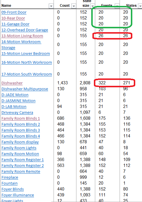 Thanks, let me look at that. It seems to be an issue where the limits aren't being respected on some devices. I clicked the global "apply 20 / 20 to all devices" from the log section. Checked one of my devices, it was still stuck at 5 / 5. The "13-motion living room" from my image above was stuck at 10 / 10 (didn't accept the 20 / 20), but after a reboot, it just continuously climbed. Right now it's at 238 events / states and climbing (those are particularly spamming triggers, so I wanted them clipped low)