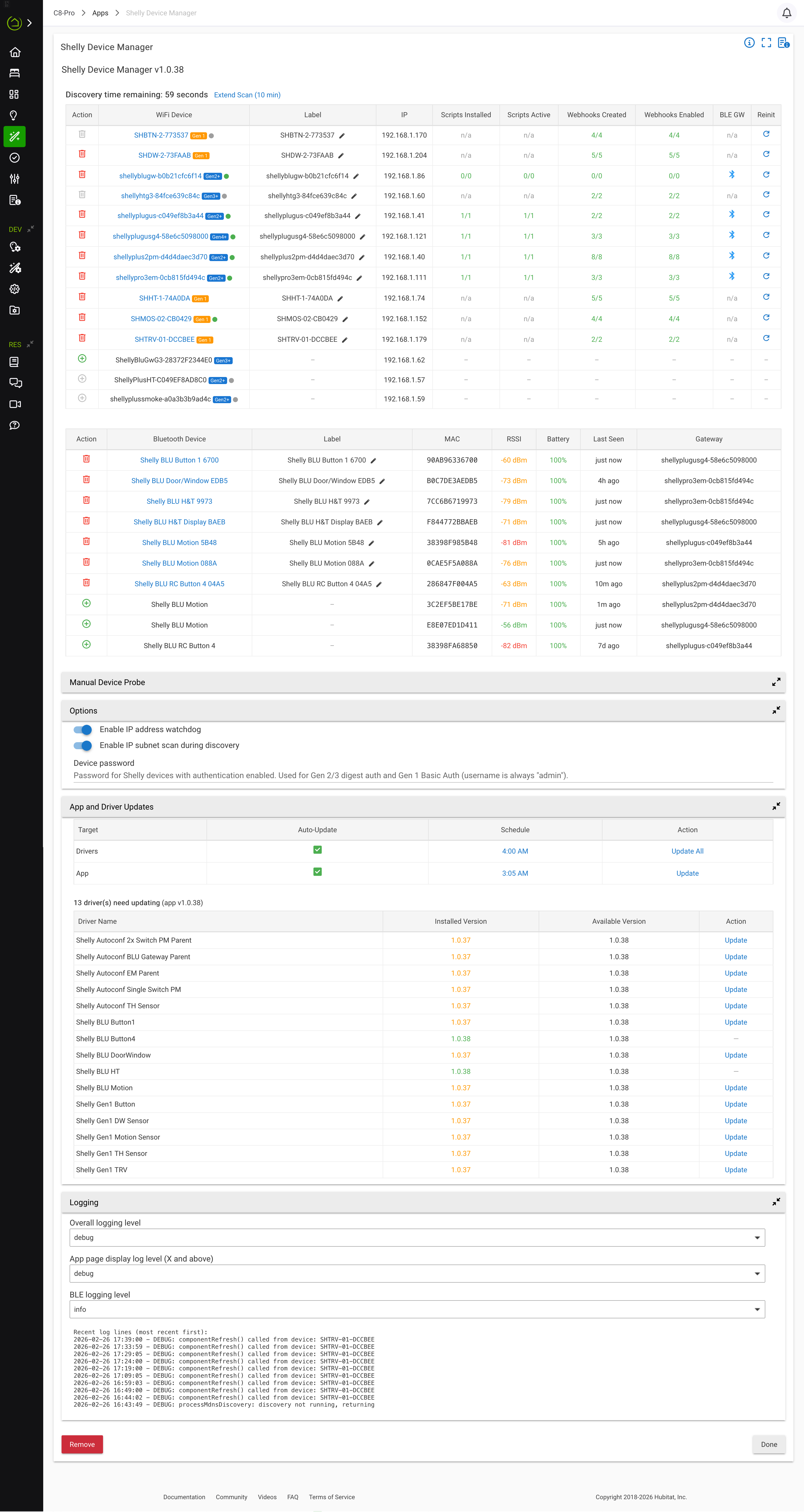 I've been working on a new "Shelly Device Manager" app, with a full suite of drivers. It's an app that displays all the "discovered" Shelly devices on your network. If you have one or more Shelly Devices installed, and you've enabled the "Bluetooth Gateway" functionality of the app, it'll autodiscover Shelly BLU devices as well. It runs mDNS and a subnet scan for Shelly devices, and you can manually specify an IP address or dns name for it to probe manually, too, if needed.