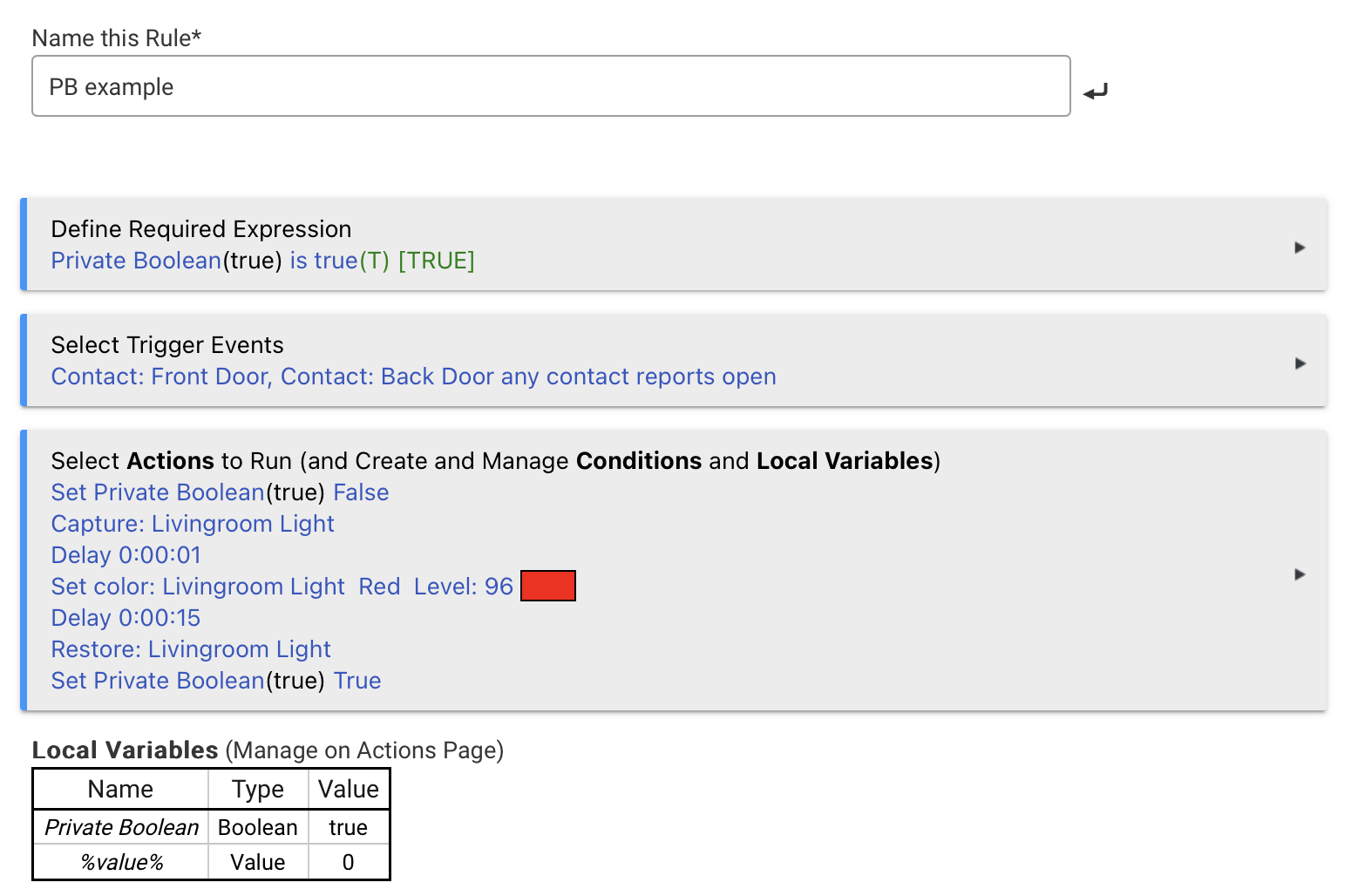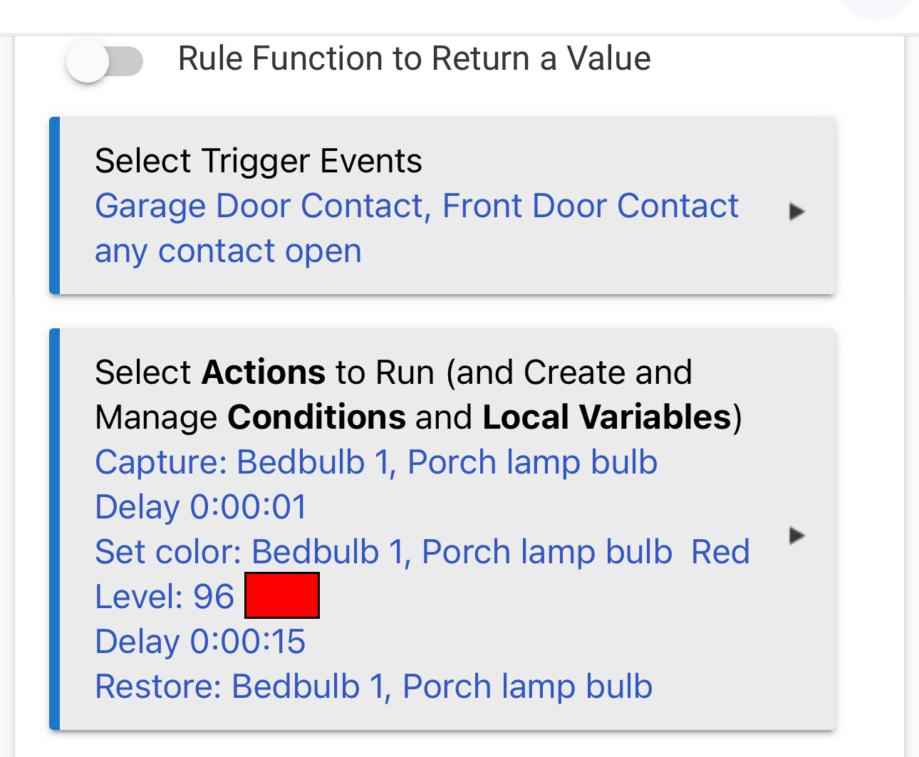 {"deviceReplacements":{"300":{"deviceName":"Virtual Contact Sensor","deviceLabel":"Contact: Front Door","deviceTypeName":"Virtual Contact Sensor","deviceTypeNamespace":"hubitat"},"297":{"deviceName":"Virtual Contact Sensor","deviceLabel":"Contact: Back Door","deviceTypeName":"Virtual Contact Sensor","deviceTypeNamespace":"hubitat"},"14":{"deviceName":"Livingroom Light","deviceLabel":"Livingroom Light","deviceTypeName":"Group Bulb Dimmer-2.1","deviceTypeNamespace":"hubitat"}},"appReplacements":{"282":{"appTypeName":"Rule-5.1","appTypeNamespace":"hubitat","appType":"sys","appName":"Rule-5.1","appLabel":"PB example","parentAppInstalledAppId":"35","parentAppTypeName":"Rule Machine","parentAppTypeNamespace":"hubitat","parentAppName":"Rule Machine","parentAppLabel":"Rule Machine","childApps":{},"singleInstance":false}},"appData":{"282":{"state":{"parens":{"0":0},"actionDone":true,"p.PB":"true","ndx":4,"dateFormat":"yyyy-MM-dd","installedRules":[{"201":"Announcements: Dryer done"},{"123":"Announcements: Empty Litter Box"},{"119":"Announcements: Mail"},{"120":"Announcements: Washer done"},{"36":"Geofence: Arrive Home"},{"38":"Geofence: Leave Home"},{"127":"Hubitat: Periodic Platform Check"},{"126":"Hubitat: Periodic Zigbee Radio Check"},{"138":"LGTV: On - JoinTV"},{"116":"Lighting: 2AM landscape lighting off"},{"146":"Lighting: Christmas Evening Lights"},{"111":"Lighting: Driveway Motion"},{"50":"Lighting: Evening lights"},{"112":"Lighting: Front Porch Motion"},{"183":"Lighting: HVAC Closet"},{"130":"Lighting: Laundry"},{"186":"Lighting: Main Bathroom"},{"46":"Lighting: Morning Lights Off"},{"85":"Lighting: Outdoor Closet"},{"99":"Lighting: Shed"},{"215":"Lighting: Shed kludge"},{"192":"Lighting: Upstairs Hallway"},{"135":"Manual Control: Driveway"},{"136":"Manual Control: Laundry"},{"190":"Manual Control: Main Bathroom"},{"134":"Manual Control: Shed"},{"194":"Manual Control: Upstairs Hallway"},{"230":"Mode Away/Sleep: Lock doors"},{"185":"Mode Away/Sleep: Lock doors (old)"},{"219":"Notifications: Lock - Back Door"},{"221":"Notifications: Lock - Front Door"},{"223":"Notifications: Lock - Kitchen Patio"},{"227":"Notifications: Lock - Outdoor Closet"},{"256":"Pond: Heater"},{"48":"Reset Private Booleans"},{"209":"Reset Private Booleans 2"},{"213":"Rule-Test: Temperature + PB"},{"44":"Sleep: Goodnight"},{"40":"Sleep: Wake Up"},{"55":"SleepNumber Ashok: Set Firmness to 100 in the AM"},{"75":"SleepNumber Ashok: Unoccupied"},{"79":"SleepNumber Bed Left: Set Firmness to 100 in the AM"},{"77":"SleepNumber Bed Left: Unoccupied"},{"131":"SleepNumber Guest Bed: deflate/inflate"},{"47":"Timed Switch: Bug Zappers sunset to sunrise"},{"90":"Timed Switch: Holiday off at 9:00"},{"43":"Timed Switch: Paper Shredder 5 minutes max"},{"41":"Timed Switch: Water Heater 30 minutes max"},{"212":"Water Main: Heat Tape"}],"clonedName":"PB example","selectActionsParams":{"label":"PB example"},"editCondIf":null,"stopOnST":false,"usesTime":false,"trigCustoms":[],"inUseTrigConds":[],"setDisabledActs":true,"capabDone":true,"predCapabs":[2],"locationBlocked":[],"pbFixed":true,"ruleNdx":1,"notEqual":true,"firstR":{"0":false},"actionList":["1","2","3","4","5","6","7"],"capture":"capture.2","timeHandlersUpdated":true,"actLabelIndent":"","unUsed":[],"prevStateUpdated":true,"varSettingsUpdated":true,"certainTimes":[],"disabledActions":[],"hasWhileRule":false,"paramsDone":true,"eval":{"0":[2]},"capabstrue":{"1":"Contact: Front Door, Contact: Back Door any contact reports open"},"lastEvtDate":"2025-02-08","unusedConds":["2"],"nestedInIf":[],"actions":{"1":{"quick":true,"method":"getSetPrivateBoolean","indent":""},"2":{"quick":true,"method":"getCapture","indent":""},"3":{"quick":false,"delay":"0:00:01","method":"getDelay","indent":""},"4":{"quick":true,"method":"getSetColor","indent":""},"5":{"quick":false,"delay":"0:00:15","method":"getDelay","indent":""},"6":{"quick":true,"method":"getRestore","indent":""},"7":{"quick":true,"method":"getSetPrivateBoolean","indent":""}},"usesDate":false,"actNdx":8,"lastEvtValue":0,"installed":true,"waitEvents":[],"private":"true","predPB":true,"running":false,"copyL":[],"simpleCond":false,"changedValues":true,"nestedRepIf":[],"lastEvtTime":"08:35","condOper":"cond","hasPredicate":true,"nestedElse":[],"varTriggersFixed":true,"setCopyActs":true,"cutAction":[],"broken":false,"fixedMarkIfs":true,"stopped":false,"rulesList":[],"hasPrev":[],"nestedLabel":[],"oldInputAct":true,"inputAct":true,"stateVarsUpdated":true,"token":1,"waitCondNdx":1,"capabsfalse":{"2":"Private Boolean<span style='color:black'>(true)</span> is true"},"stPrimed":true,"allLocalVars":{},"varSettingsOld":{},"timeFormat":"HH:mm","doActN":"N","olddValues":true,"inUseConds":["2"]},"appSettings":[{"deviceList":null,"multiple":false,"name":"tCapab1","type":"enum","value":"Contact"},{"deviceList":null,"multiple":false,"name":"not2","type":"bool","value":""},{"deviceList":null,"multiple":false,"name":"useST","type":"bool","value":"true"},{"deviceList":{"300":"Contact: Front Door","297":"Contact: Back Door"},"multiple":true,"name":"tDev1","type":"capability.contactSensor","value":null},{"deviceList":null,"multiple":false,"name":"tstate1","type":"enum","value":"open"},{"deviceList":null,"multiple":false,"name":"isCondTrig.1","type":"bool","value":""},{"deviceList":null,"multiple":false,"name":"dValues","type":"bool","value":"true"},{"deviceList":null,"multiple":false,"name":"pointless","type":"button","value":""},{"deviceList":null,"multiple":false,"name":"comments","type":"textarea","value":""},{"deviceList":null,"multiple":false,"name":"hasAll","type":"button","value":""},{"deviceList":null,"multiple":false,"name":"isFunction","type":"bool","value":""},{"deviceList":null,"multiple":false,"name":"cancelCapab","type":"button","value":""},{"deviceList":null,"multiple":false,"name":"editToken","type":"button","value":""},{"deviceList":null,"multiple":false,"name":"lvTable","type":"button","value":""},{"deviceList":null,"multiple":false,"name":"stat