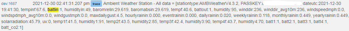 As far as I can tell, Ambient's reporting only gives a 1 ('good') or 0 ('dead'?) for the battery value. I suspect that's the "batt: 1" in the state variable.