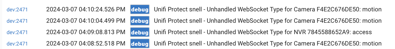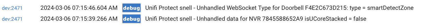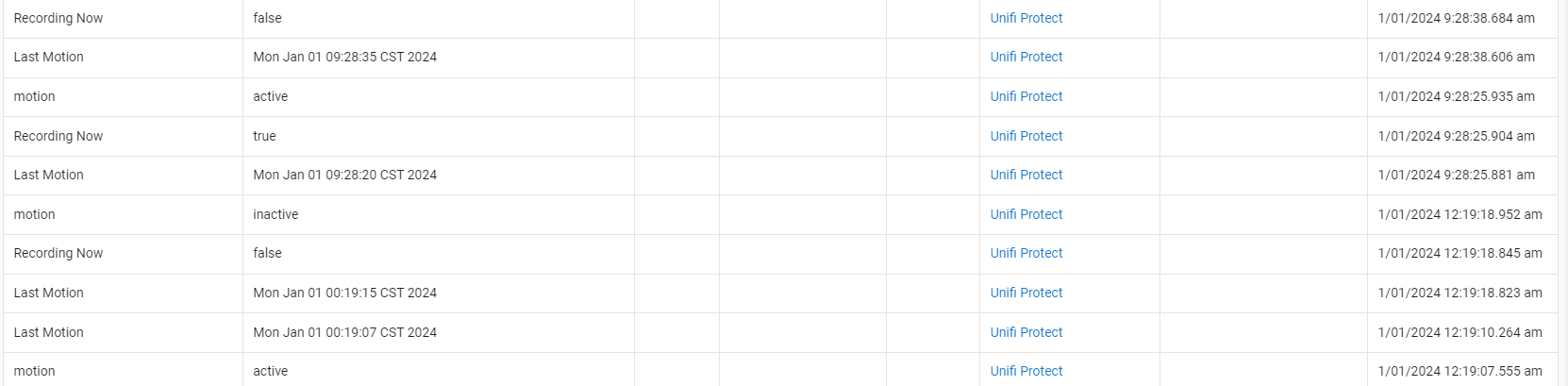 I was just checking on the device again and I noticed that events were not being created after 3:18pm today. Below are the current attributes for the Unifi Protect parent (WebSocket Open = closed) now. During this time window, tomw's driver has been creating events.