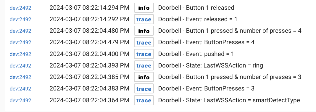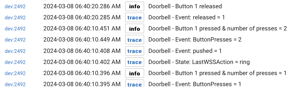 WebSocket are gone because they are being handled. There is a pushed event at the very middle 8:22:04. It even got the "released" event from the doorbell as well (that is one of very few button devices I have ever been able to code that in for).