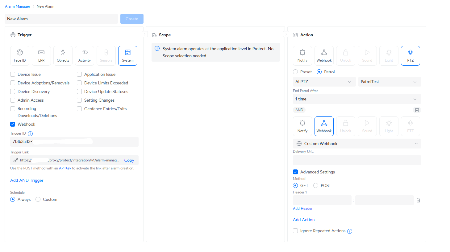 If a person doesn't have a newer PTZ camera set up they wont be able to see all of the options when creating a system alarm webhook. This is what it looks like: